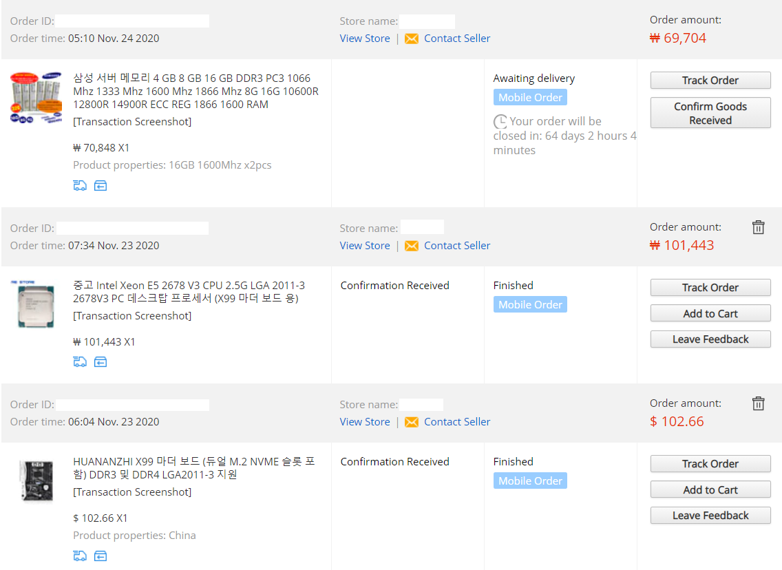 알리 블랙 프라이데이 행사 즈음하여 서버CPU 중 가성비가 탁월한 E5-2678 V3, DDR4 대비 반값 수준인 서버용 DDR3 램, LGA2011-3 지원 보드 중 평이 후한 HUANANZHI사의 제품 조합으로 장바구니에 미리 담아두었다.